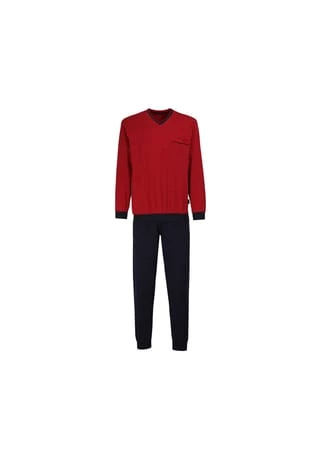 Bequemer Schlafanzug aus hundertprozentiger Baumwoll-Qualität für ein angenehmes Tragegefühl – atmungsaktiv und hautsympathisch. Mit V-Ausschnitt und Brusttasche.