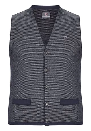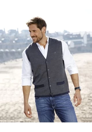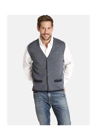 JAN VANDERSTORM ist Ihr Experte für Herrenmode in großen Größen. Hochwertige Weste, die bestens zu festlichen Anlässen passt. TANE im zweifarbigen Strickdesign ist mit fünf Knöpfen zu schließen. JV-Logo Stickerei auf der Brust. Zwei aufgesetzte Patten. Farblich abgesetzter Saum. Paspelierter V-Ausschnitt und Armausschnitte. 50% Wolle, 50% Polyacryl. Maschinenwäsche.