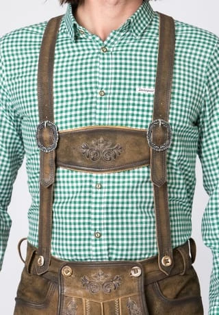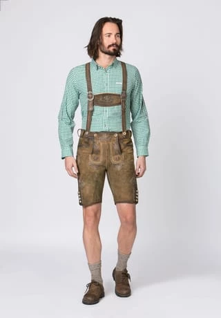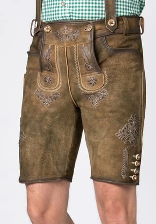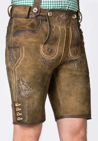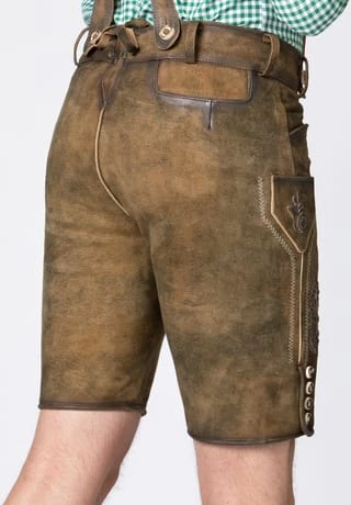 Trachtenlederhose Beppo von Stockerpoint Classics. Die kurze Lederhose aus hochwertig gegerbtem Wildbock Leder in Hirschoptik zeichnet sich durch die außergewöhnliche Strukturierung aus und harmoniert perfekt mit den typischen Hornknöpfen. Sie ist die am meisten gekaufte Trachtenlederhose. Die traditionelle Stickerei steht dezent im Vordergrund und verleiht dem Modell ihren typischen Charakter. Die Hose wird mit einem passenden H-Träger geliefert. Sie ist ein Allrounder und lässt sich zu vielen klassischen Trachtenoutfits perfekt kombinieren.