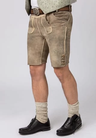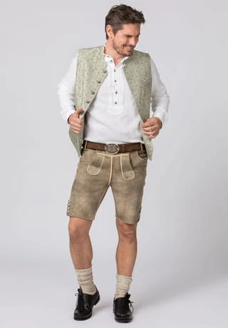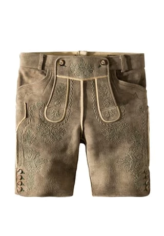 Hirschlederhose Gaishorn von Bergfeuer. Die kurze Lederhose aus hochwertig sämisch gegerbtem Hirschleder ist in Design und Qualität auf Zeitlosigkeit und Langlebigkeit ausgelegt. Das exklusive Modell in den verschiedenen traditionellen Farben ist mit sehr viel Eichenlaub-Stickerei aufwendig bestickt und wird nach alten Vorbildern gefertigt. Dieses hochwertige Modell ist liebevoll und mit viel Herzblut von Hand geäscht und gespeckt, damit der angesagte Vintage Look garantiert ist. Ein ständiger Begleiter und idealer Kombipartner für deine Lieblingstracht.