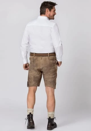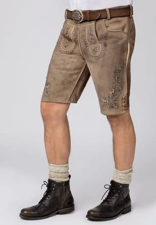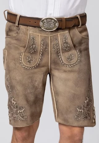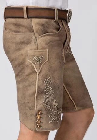 Hirschlederhose Hochkogl von Bergfeuer. Die kurze Lederhose aus hochwertig sämisch gegerbtem Hirschleder ist in Design und Qualität auf Zeitlosigkeit und Langlebigkeit ausgelegt. Das exklusive Modell in den verschiedenen traditionellen Farben ist mit Hirschmotiven und Eichenlaub bestickt und wird nach alten Vorbildern gefertigt. Dieses hochwertige Modell ist liebevoll und mit viel Herzblut von Hand geäscht und gespeckt, damit der angesagte Vintage Look garantiert ist. Ein ständiger Begleiter und idealer Kombipartner für deine Lieblingstracht.