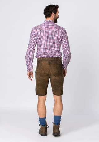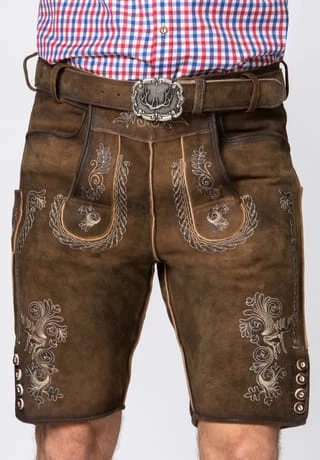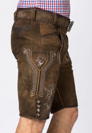 Trachtenlederhose Thomas von Stockerpoint Classics in stein geäscht. Die kurze Lederhose aus hochwertig gegerbtem Wildbock Leder in Hirschoptik zeichnet sich durch die außergewöhnliche Strukturierung aus und harmoniert perfekt mit den klassischen Hornknöpfen. Sie ist die am meisten gekaufte Trachtenlederhose. Die traditionelle Stickerei steht dezent im Vordergrund und verleiht dem Modell ihren typischen Charakter. Die Hose wird mit einem Gürtel und einer Schließe mit Hirschmotiv in altsilber geliefert. Sie ist ein Allrounder und lässt sich zu vielen Trachtenoutfits perfekt kombinieren.