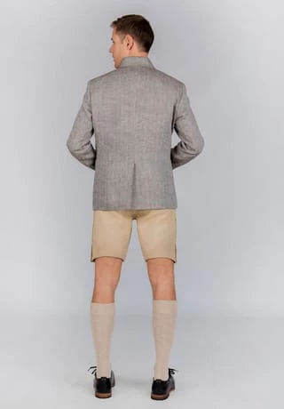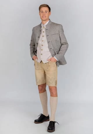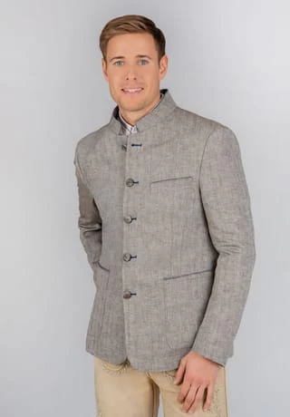 Trachtensakko Benito von Bergfeuer in nougat. Der traditionelle Trachtenjanker ist aus einem hochwertigen, melierten Leinen gefertigt. Die klassische, gerade Schnittführung garantiert eine sehr gute Passform und einen angenehmen Tragekomfort. Farblich abgestimmter Stehkragen und Paspel unterstreichen das markante Design. Rustikale Hornknöpfe runden das edle Erscheinungsbild gekonnt ab. Das Sakko ist der ideale Kombipartner zu unseren Trachtenwesten und prägen den klassischen Trachtenlook.