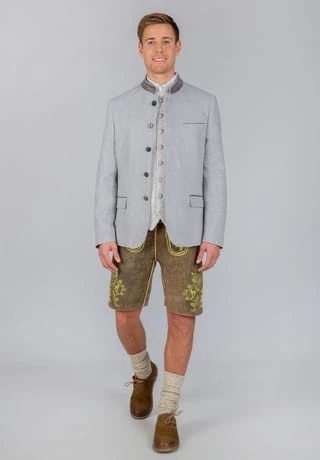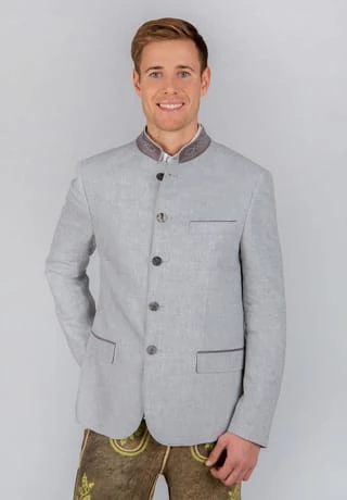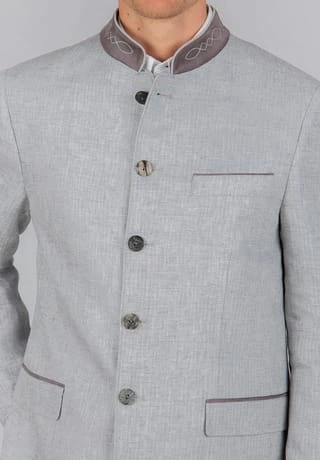 Trachtensakko Tizian von Bergfeuer. Der traditionelle Trachtenjanker ist aus einer hochwertigen melierten Leinen-Baumwollmischung gefertigt. Die klassische, gerade Schnittführung garantiert eine sehr gute Passform und einen angenehmen Tragekomfort. Farblich abgestimmter Stehkragen und Paspel unterstreichen das markante Design. Rustikale Hornknöpfe runden das edle Erscheinungsbild gekonnt ab. Das Sakko ist der ideale Kombipartner zu unseren Trachtenwesten und prägen den klassischen Trachtenlook.