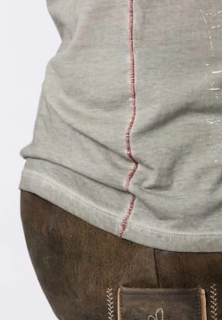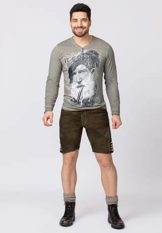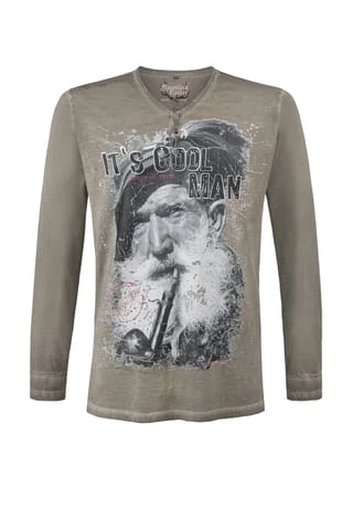 T-Shirt Coolman2 von Mountain Rocker in stein. Das im „Comfort-Fit“ geschnittene Langarm-Shirt aus der „Wiesn Rider Kollektion“ in hochwertiger Baumwoll-Qualität überzeugt durch den angesagten Print mit dem Schriftzug „It´s Coolman“. Für die coole Optik sorgt die trendige „Used washed Optik“ und setzt das stylische Designmotiv perfekt in Szene. Der V-Ausschnitt mit Knopfleiste ist mit passend abgestimmten Knöpfen verziert und sorgt zusätzlich für den einzigartigen Look. Das Shirt lässt sich lässig zu Lederhose und zur Jeans tragen und ist ein unverzichtbares Statement für coole Typen.