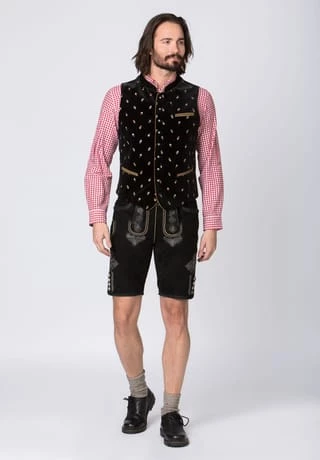 Trachtenweste Calzado von Stockerpoint Classics. Die klassische Weste aus hochwertigem Baumwollsamt ist der Klassiker unter den Trachtenwesten. Die aufwendige Stickerei prägt diesen unverwechselbaren Stil und geben dem Modell eine besondere Note. Die klassische, gerade Schnittführung garantiert eine sehr gute Passform und einen angenehmen Tragekomfort. Farblich abgestimmter Stehkragen und Paspel unterstreichen das traditionelle Design. Der Rücken ist aus schwarzem Satinstoff und lässt sich mit einem Riegel verstellen. Kugelknöpfe aus altsilber runden das edle Erscheinungsbild gekonnt ab. Die Trachtenweste ist der ideale Kombipartner zu unseren traditionellen Trachtenhemden und Lederhosen.