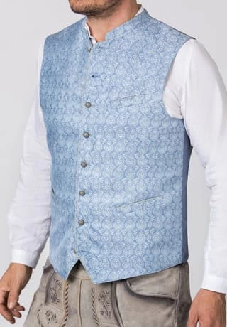 Trachtenweste Dario von Stockerpoint Classics in hellblau. Die edle Weste ist aus einem hochwertigen Jacquard Stoff in Seidenoptik gefertigt. Die gerade Schnittführung garantiert eine sehr gute Passform und einen angenehmen Tragekomfort. Der klassische Stehkragen, die Taschen und die Knopfleiste sind mit einem farblich abgestimmten Paspel gefertigt und unterstreichen das edle Design. Der Rücken ist aus einem exklusiven Satinstoff gefertigt und lässt sich mit einem Riegel verstellen. Trachtige Knöpfe in altsilber setzen sich gekonnt in Szene. Die Weste ist der ideale Kombipartner zu unseren Trachtensakkos und runden den Trachtenlook perfekt ab.