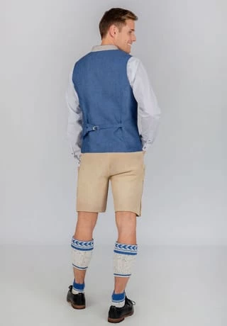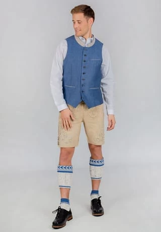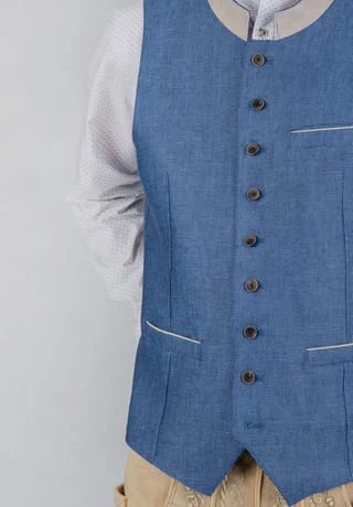 Trachtenweste Domenico von Bergfeuer. Die traditionelle Weste ist aus einem hochwertigen, melierten Leinen gefertigt. Die klassische, gerade Schnittführung garantiert eine sehr gute Passform und einen angenehmen Tragekomfort. Farblich abgestimmter Stehkragen und Paspel unterstreichen das markante Design. Rustikale Hornknöpfe runden das edle Erscheinungsbild gekonnt ab. Die Weste ist der ideale Kombipartner zu unseren Trachtensakkos und prägen den klassischen Trachtenlook.